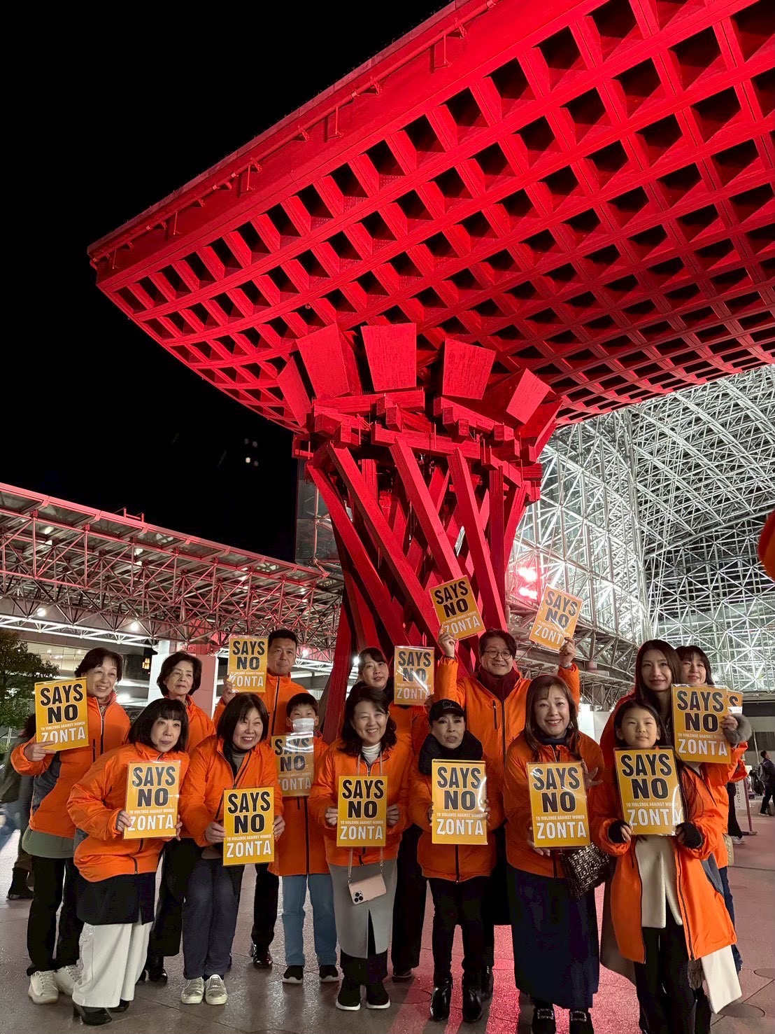2025年12月6日、女性に対する暴力撤廃を訴える国際的なキャンペーン「Zonta Says NO」に賛同し、金沢駅鼓門にてオレンジライトアップを実施しました。